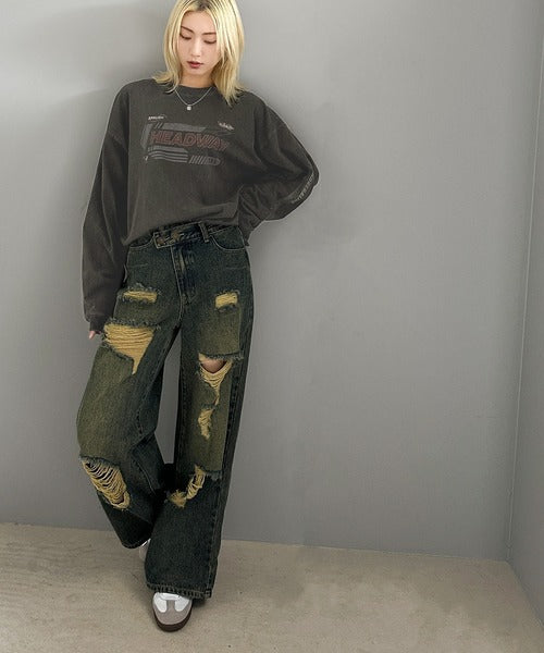 トレンド感満載のクラッシュ加工にオーバーダイ加工を施した優秀デニムです。