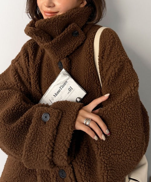 厚手の大粒ボアを使用した、大きめポケットつきショートブルゾン。
