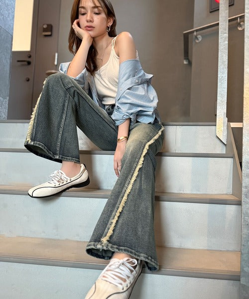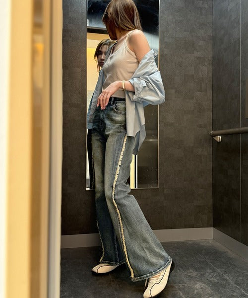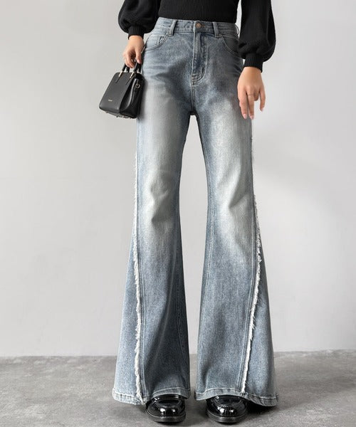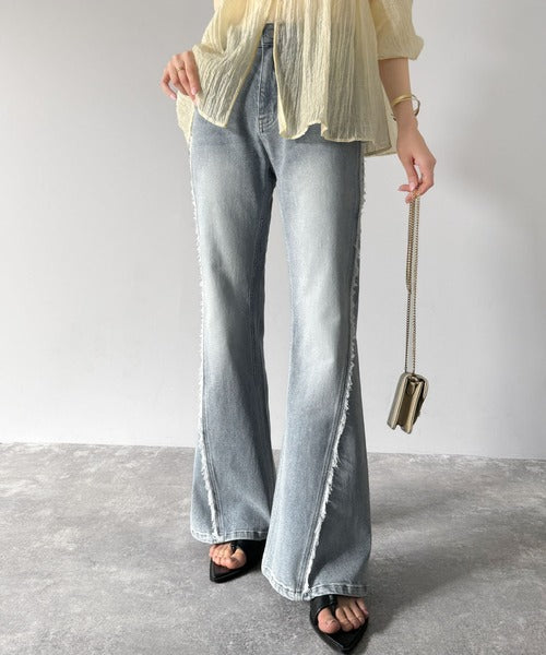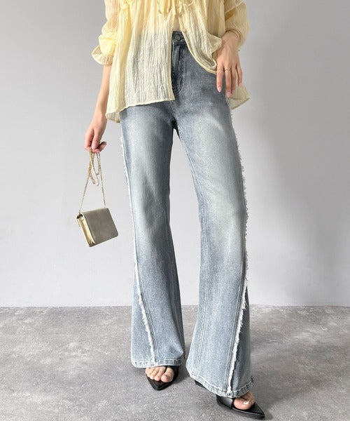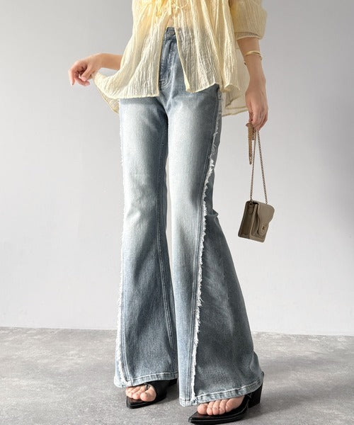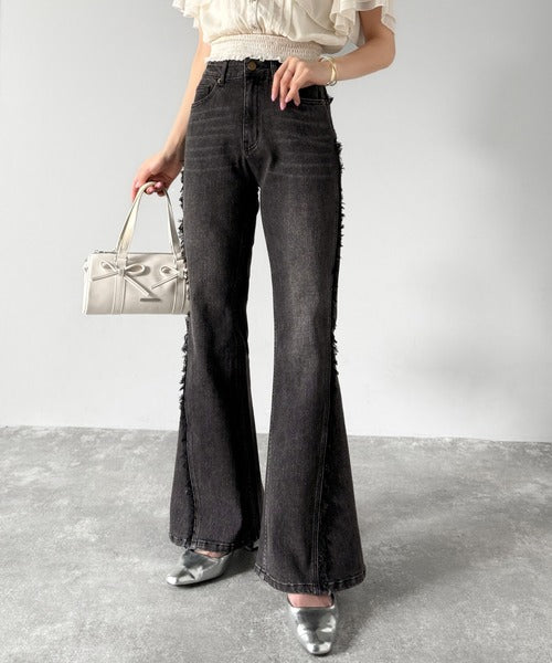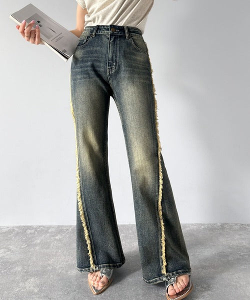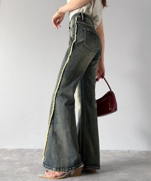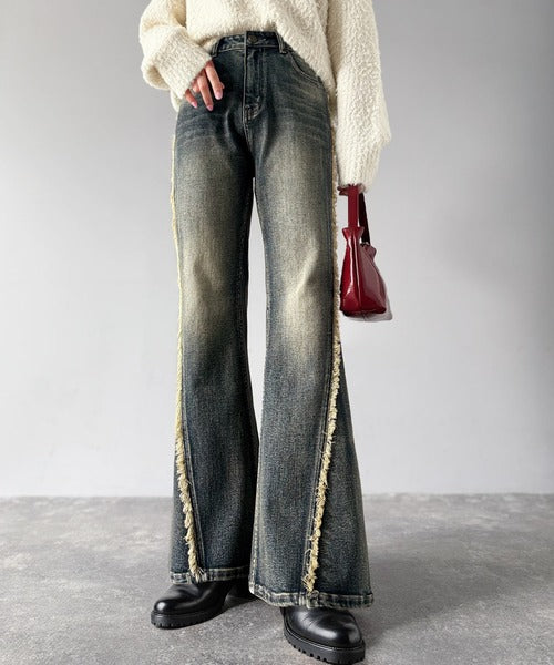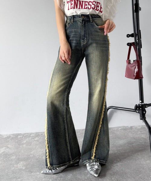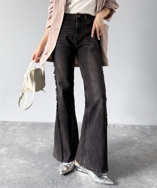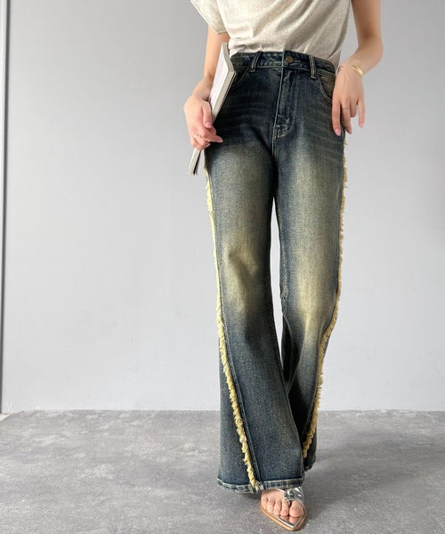 【mily bilet】とにかく美脚!サイドフリンジ使いヴィンテージ風デニムフレアパンツ mi0909006